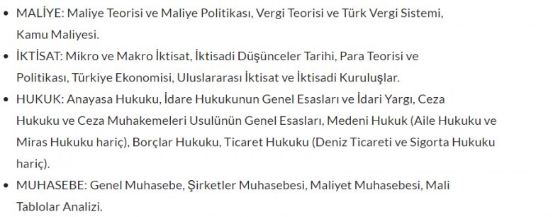 Vergi Müfettiş Yardımcılığı yazılı sınavında adaylara aşağıda yer alan konulardan sorular yöneltilmektedir;